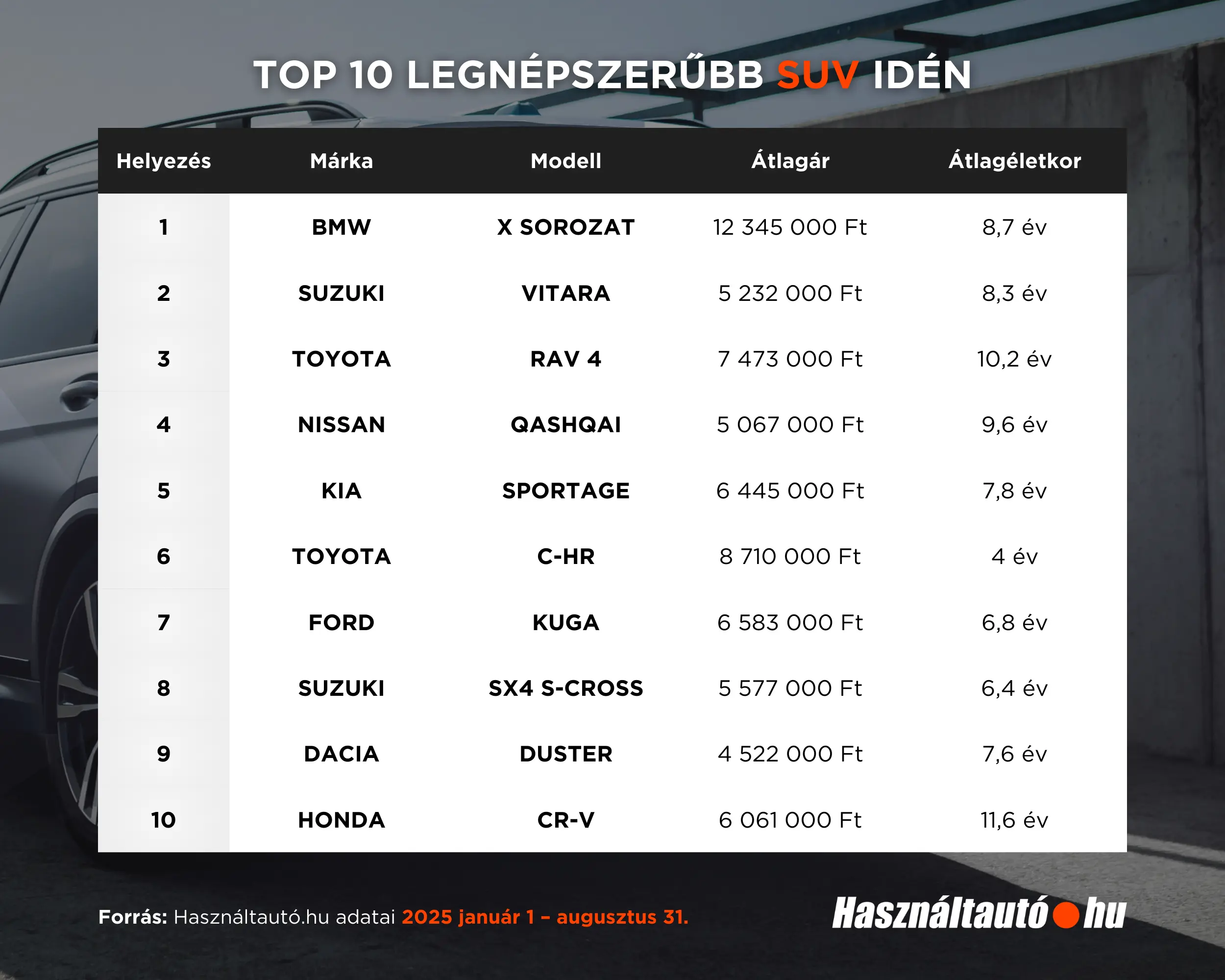 A portál által gyűjtött adatok alapján a BMW "X-sorozatát" hozták ki győztesként. Ilyen autók iránt több mint 51 ezren érdeklődtek 2025 első nyolc hónapjában, ami minimális növekedés az előző év azonos időszakához képest. Az átlagáruk is kis mértékben nőtt, 12,3 millió forintra, és a kínálat is bőséges maradt, több, mint 7700 aktív hirdetéssel. A magas, 163 ezer kilométeres átlag-futásteljesítmény és az átlagosan 8,7 éves életkor alapján azt a következtetést vonták le a Használtautó.hu szakemberei, hogy a vásárlók gyakran a prémium szegmens használt képviselői között keresik az értékállóságot.