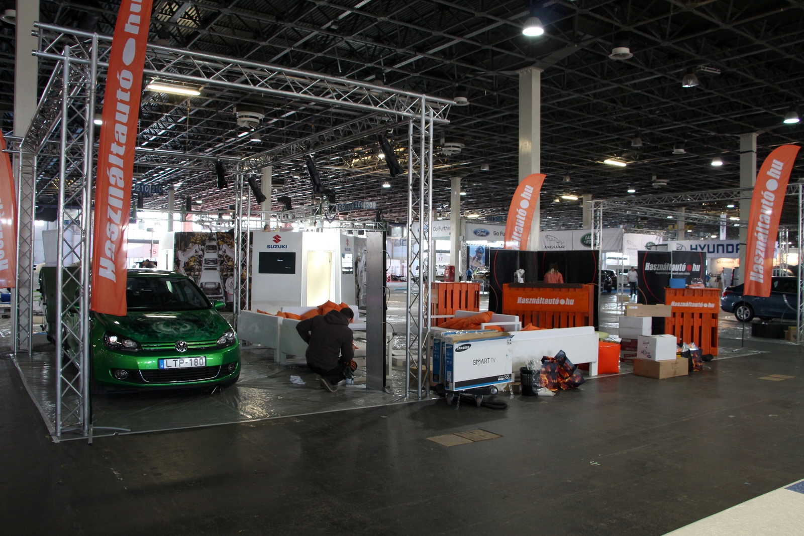 A Használtautó.hu standja épülés közben. Vendégünk egy eladó Golf. A Carstyling.hu Tuning Show arénájában 3 éve, 3 nap alatt épített, most használtan eladó Volkswagen Golf VI